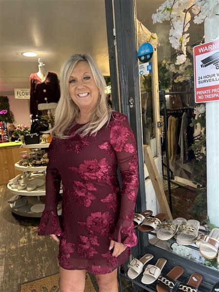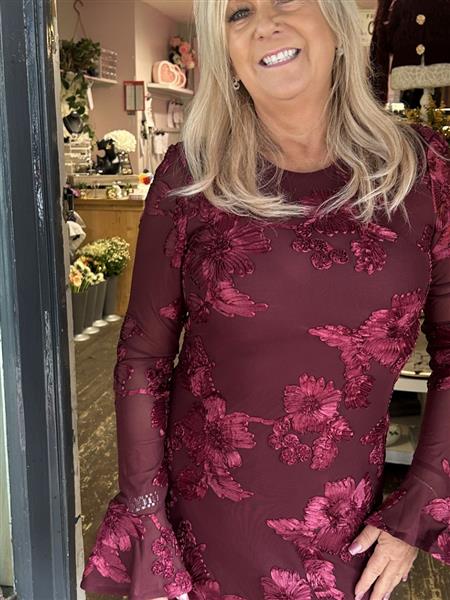Fluted Cuff Floral Applique Dress- Burgundy  zoom 2Fluted Cuff Floral Applique Dress- Burgundy  zoom 3